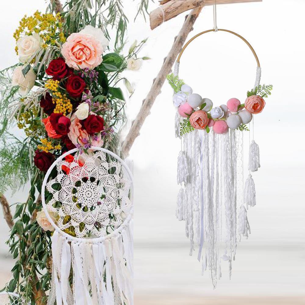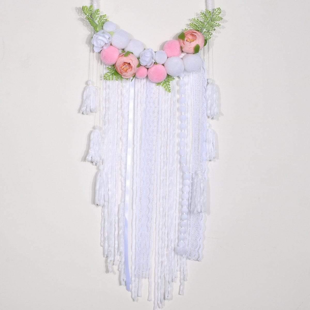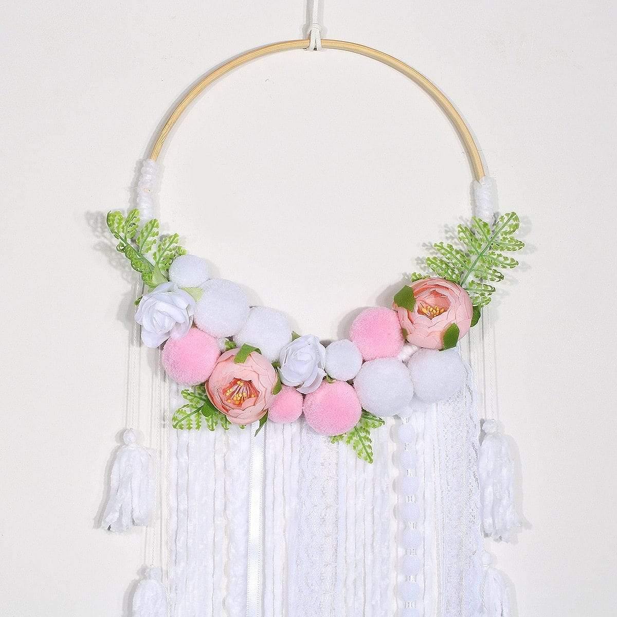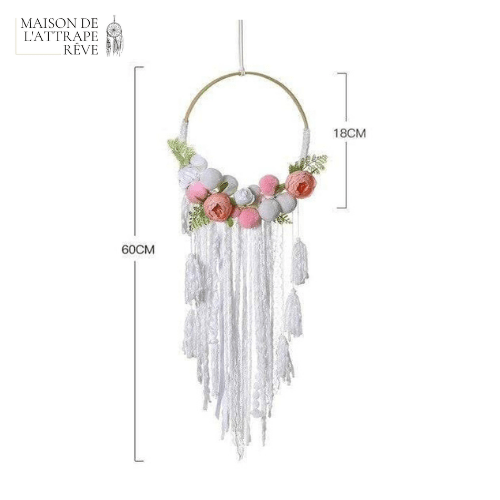 Elegansen er sikret med den blendende hvitheten i kanten, mens dusker i nyanser av hvitt og rosa vil tilføre et glimt av glamourøs og elegant sødme. Hengt på en sirkel av naturlig bambus, vil disse elementene skape en perfekt balanse, og spre en atmosfære av ro og naturlig finesse!