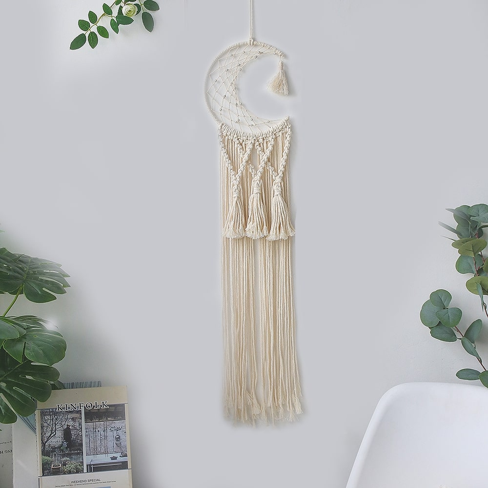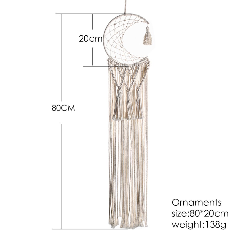 La deg forføre av den fortryllende sjarmen til denne drømmefangeren laget i makramé, som fremkaller magien fra vår månelige satellitt. Dens gunstige egenskaper, kombinert med den måneformede designen og de silkeaktige duskene, vil vokte over deg og holde mareritt og skremmende nattsynninger på avstand. Dens forfriskende og naturlige estetikk vil også revitalisere atmosfæren i ditt boareal!